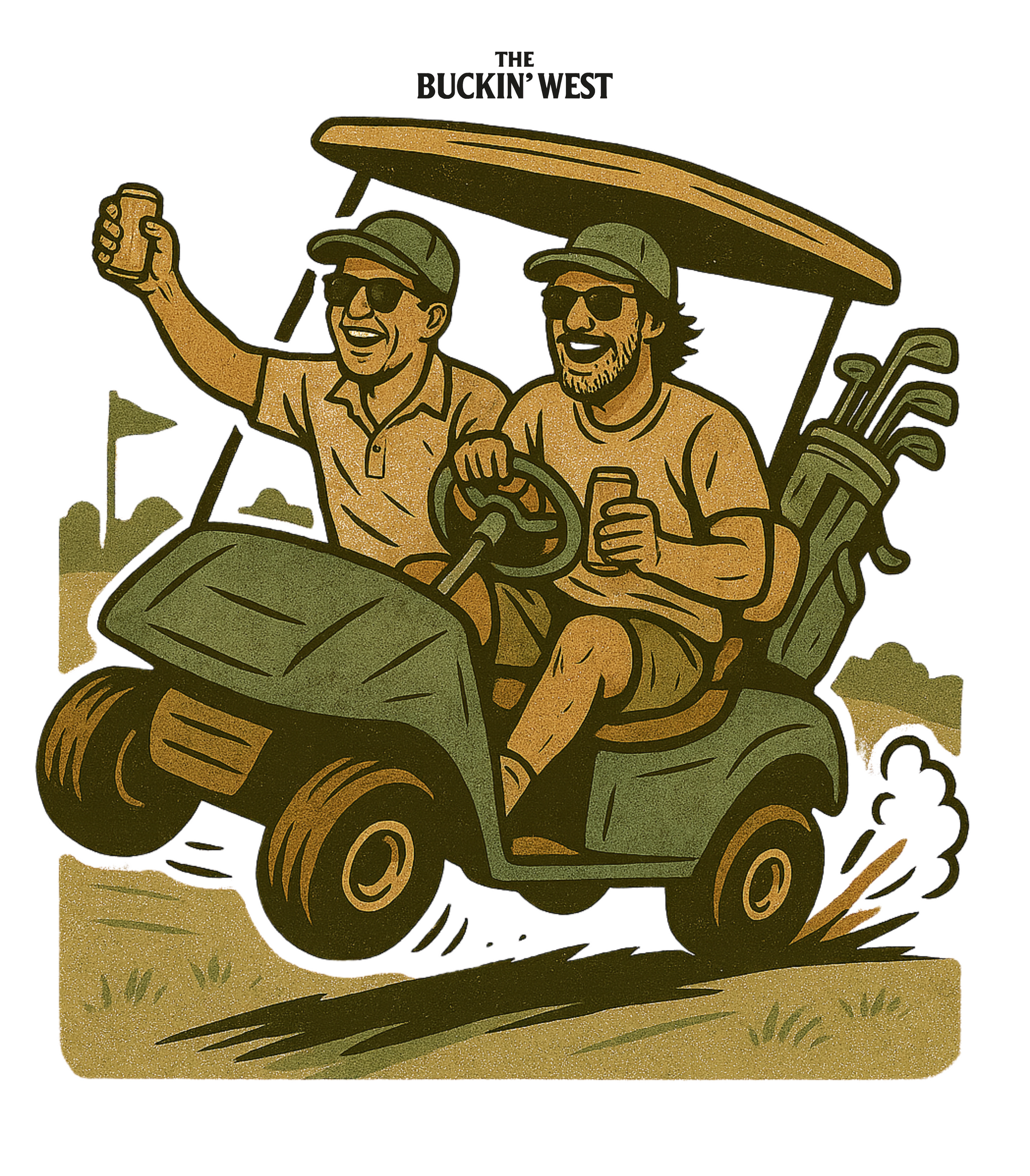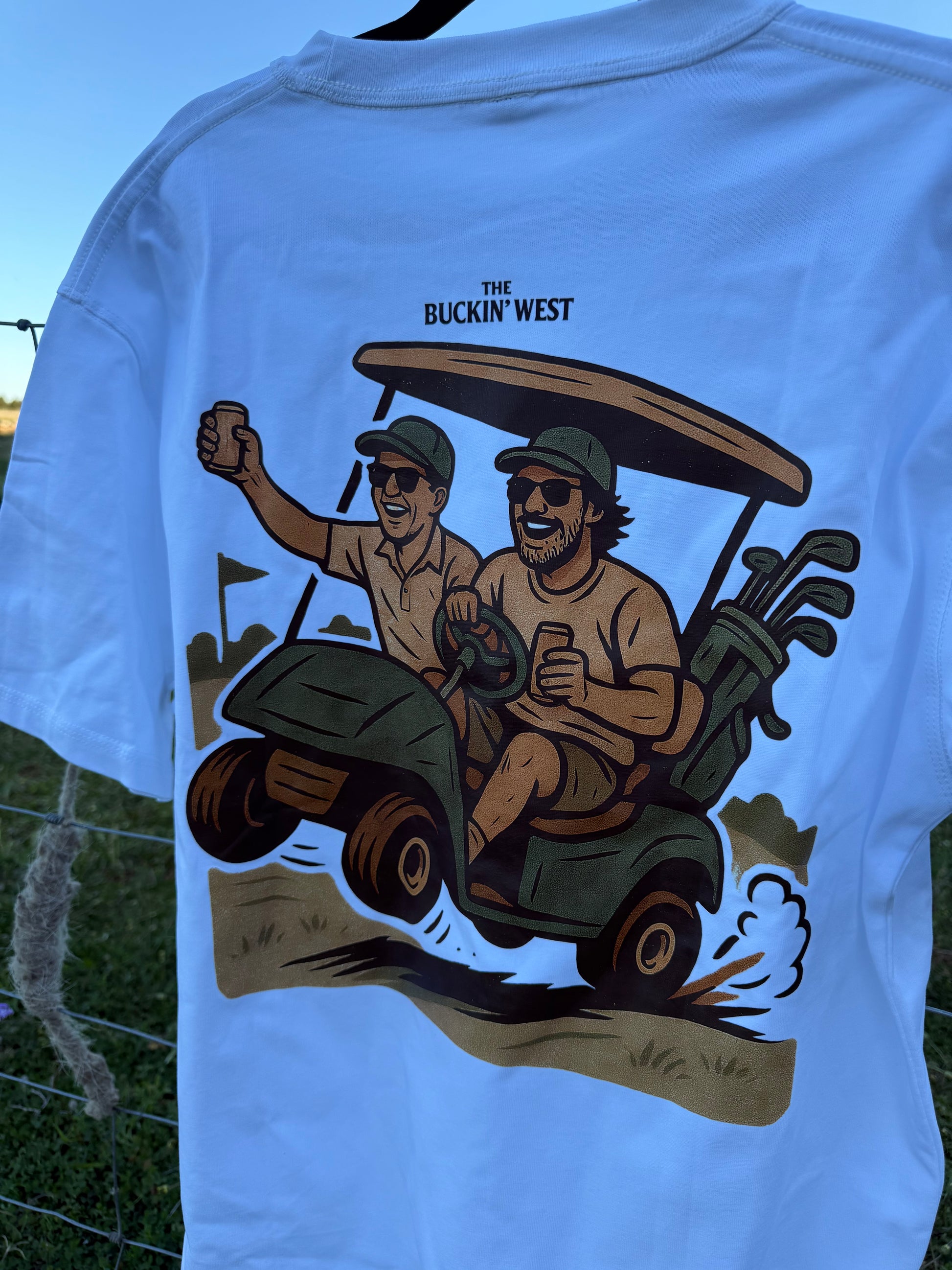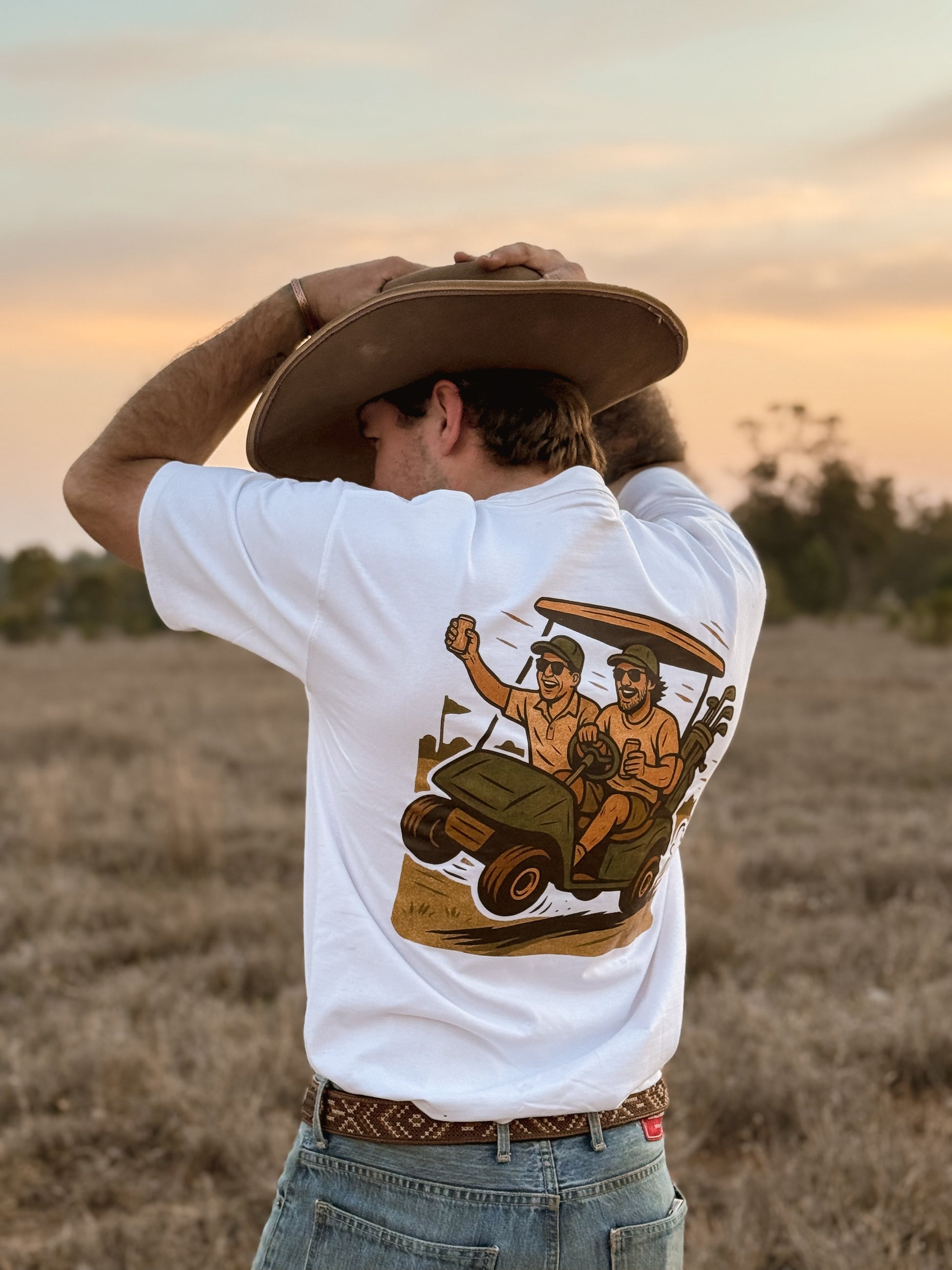 Featuring original artwork of a classic golf buggy moment, this design brings that laid-back country-club energy to the bush. It’s made for the ones who rock up in boots or bare feet, who know a good swing’s less about form and more about the company.